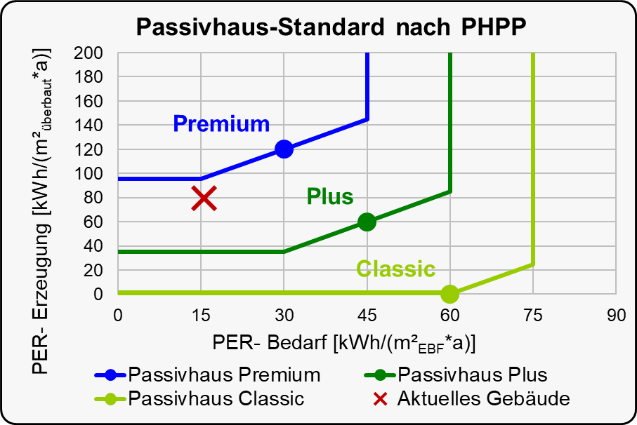 » Berechnungsverfahren: Effizienzhaus-Plus (nach BMUB) / Passivhaus-Standard (nach PHPP) / Energie-Autarkie (nach PHPP inkl. Haushaltsstrom und Energieerzeugung /-speicherung) / zusätzl. E-Auto Autarkie (Blau
